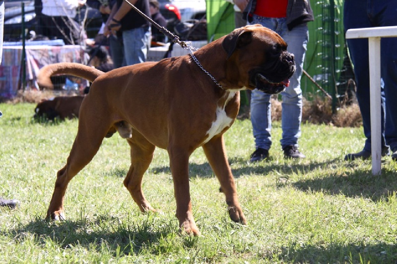 2 ans 1/2 bringé légèrement marqué en blanc Taille moyenne - CARRE Bonne sortie d'encolure Poitrine bien descendue Bon poitrail Très bonnes angulations AV/AR avec B. aplombs et pieds Oreilles et queue bien portées T. bon type de tête Rapport crâne/museau correct Stop et menton très marqué Dos de nez un peu court Yeux foncés un peu écartés TB dentition incisives moy. larges allures libres